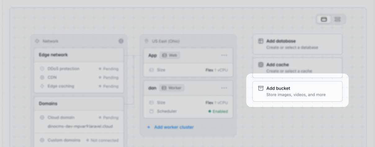 Laravel Cloud allows you to create S3-compatible object storage buckets and attach them to your application’s environments directly from the Laravel Cloud dashboard. Laravel Cloud Object Storage is offered in partnership with Cloudflare R2. Laravel Cloud Object Storage may be used as your Laravel application’s file storage backend, allowing you to interact with the bucket via Laravel’sStorage