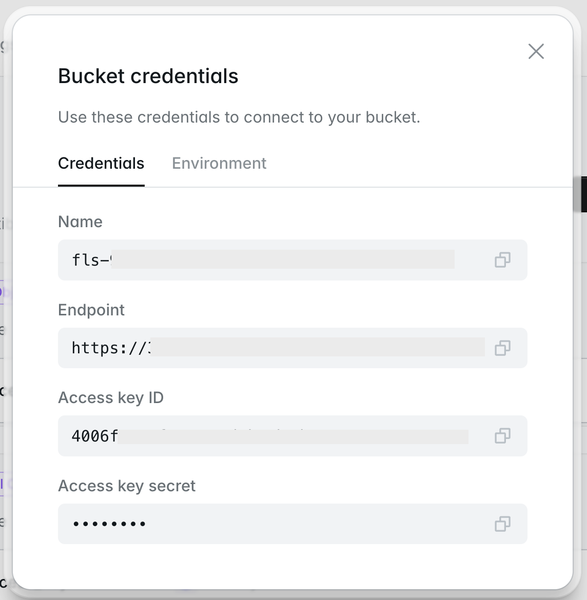 - The bucket credentials modal window will provide you with the name, endpoint, access key ID, and access key secret needed to connect to your bucket.